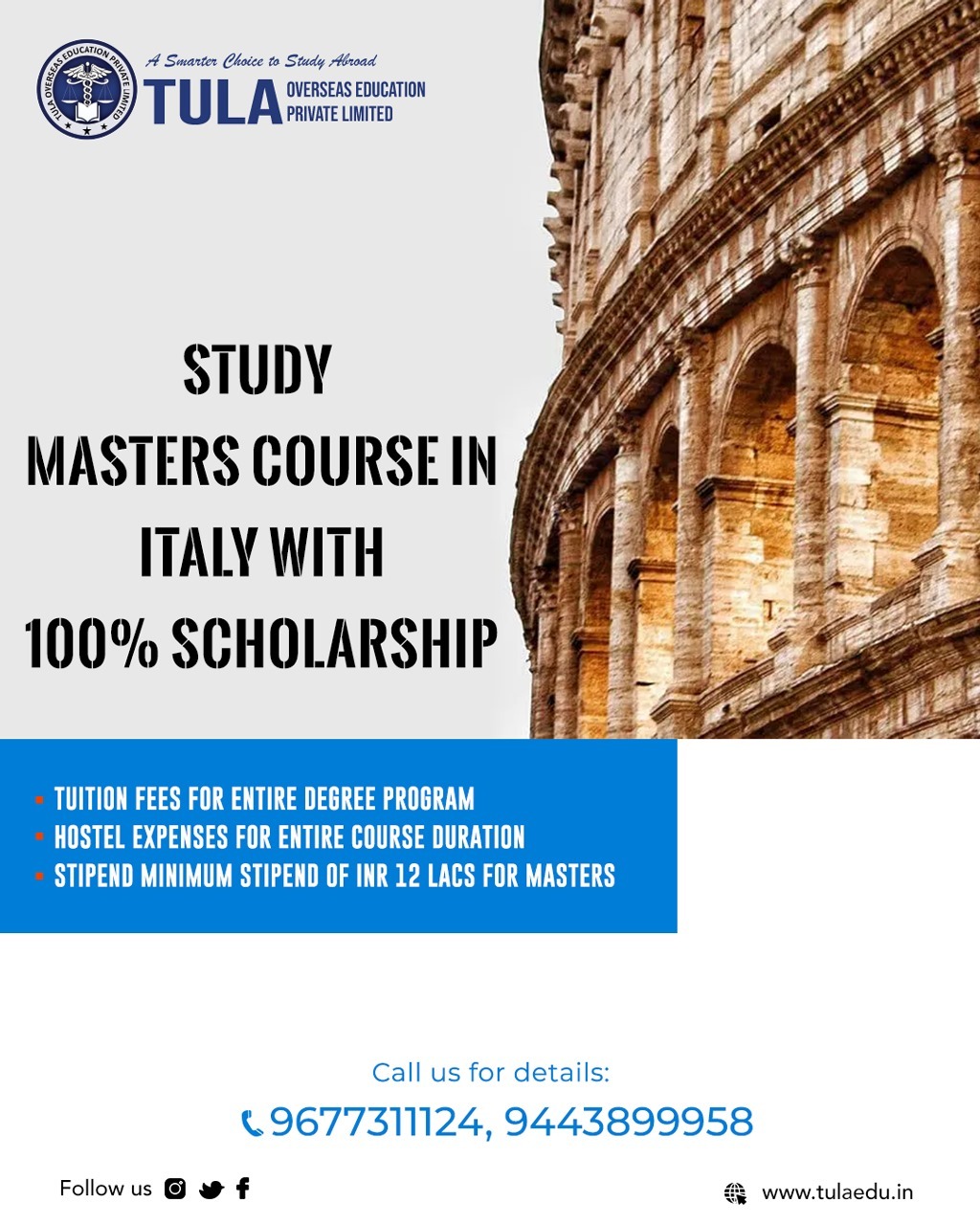 Study Master’s Course in Italy with 100% Scholarship – Tula Overseas Education Looking to pursue a Master’s course in Italy with 100% scholarship? Tula Overseas Education helps ambitious students achieve their dream of studying in top Italian universities with full financial support. Italy is one of Europe’s most popular study destinations, offering globally recognized degrees, rich academic heritage, and affordable living costs.