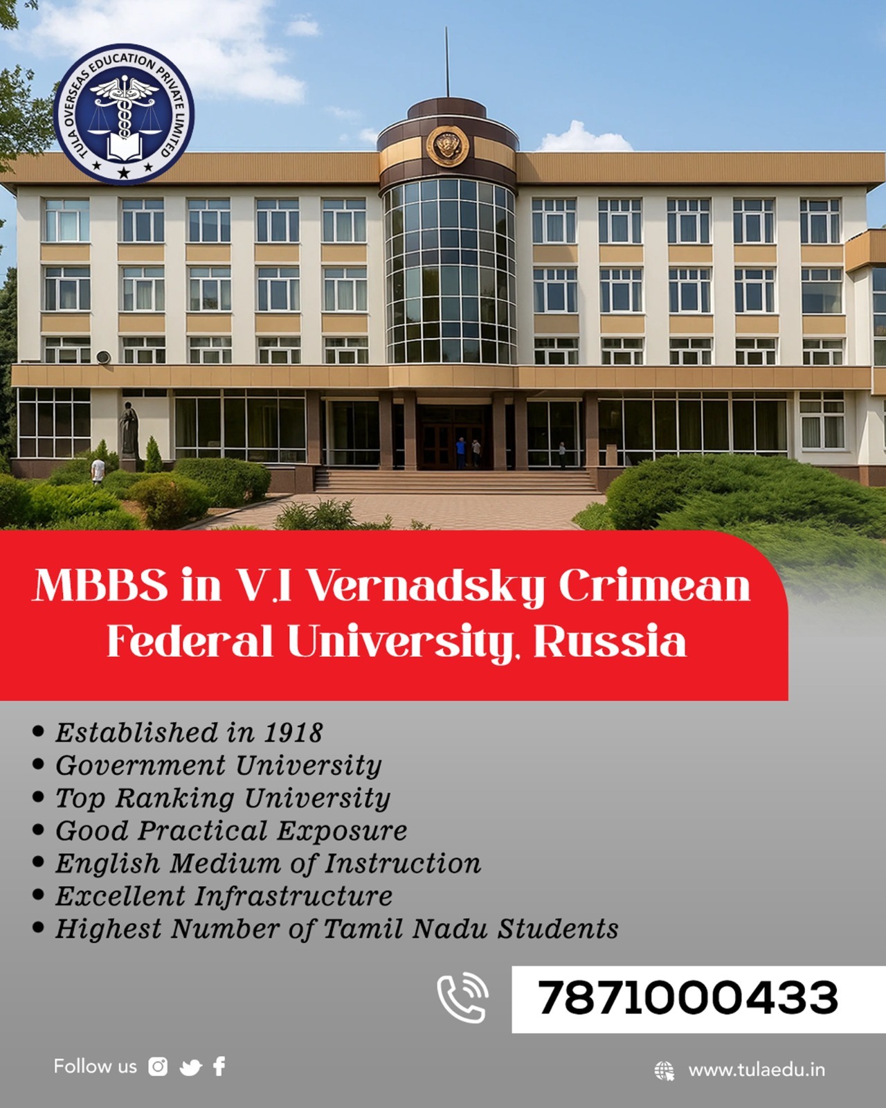 Study MBBS in top government university with Tula overseas education, the trusted education consultancy in Kuranguchavadi, Salem. Tula is the direct official representative of Crimean Federal University, Russia., with highest fmge passing rate and most perferred medical university by indian students. Get your mbbs dream fulfilled in CFU with best guidance, practicals. Call us to enroll now.