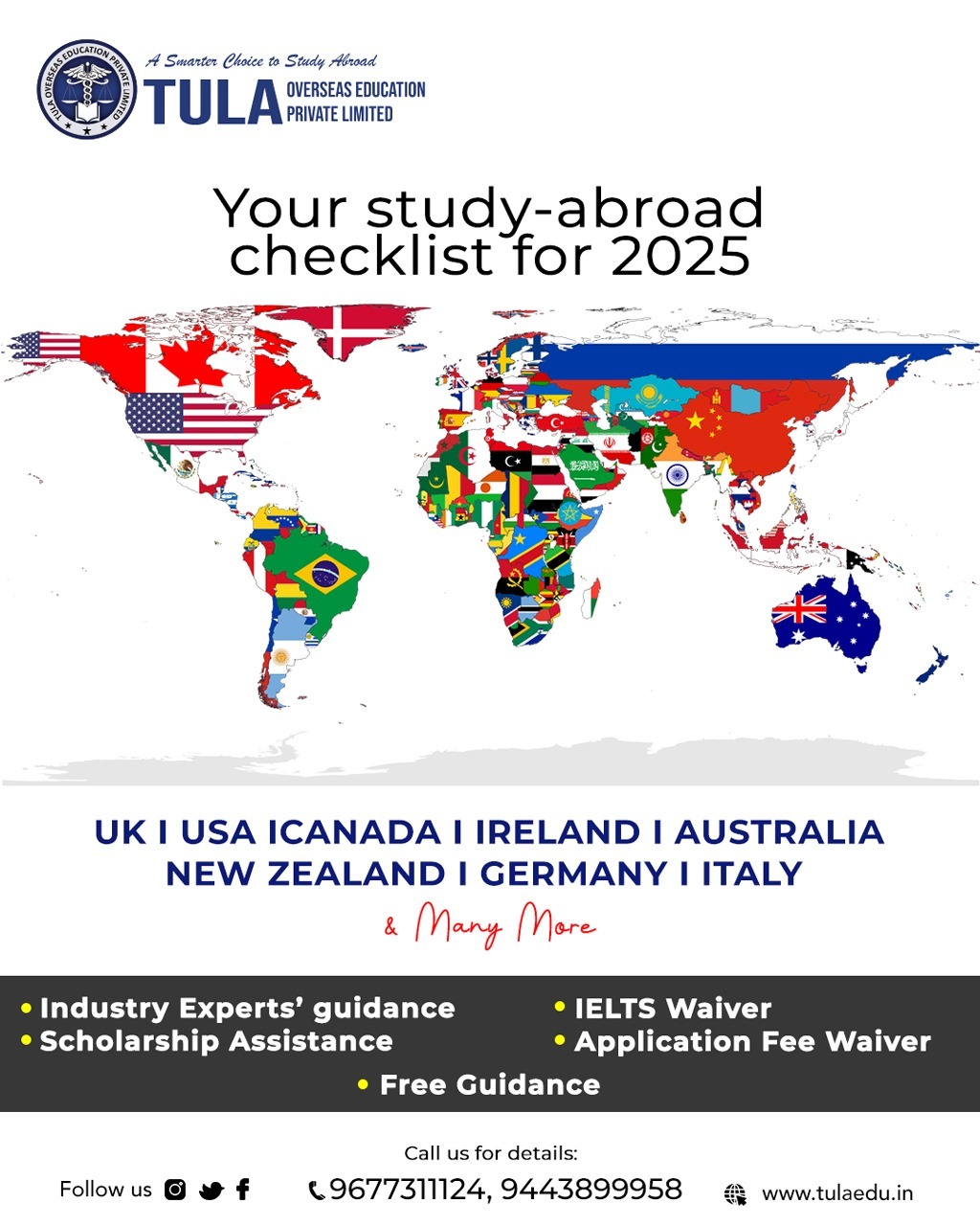 Your Study Abroad Checklist for 2025 & 2026 with Tula Overseas Education Planning to study abroad in 2025 or 2026? A well-prepared checklist is the key to securing admission in top international universities. Tula Overseas Education brings you the ultimate study abroad checklist to help you plan, apply, and succeed with confidence. Select the right course based on your career goals. Popular options include MBBS, Engineering, Nursing, UG & PG programs across countries like Russia, Europe, UK, Uzbekistan, Bangladesh, and more.
