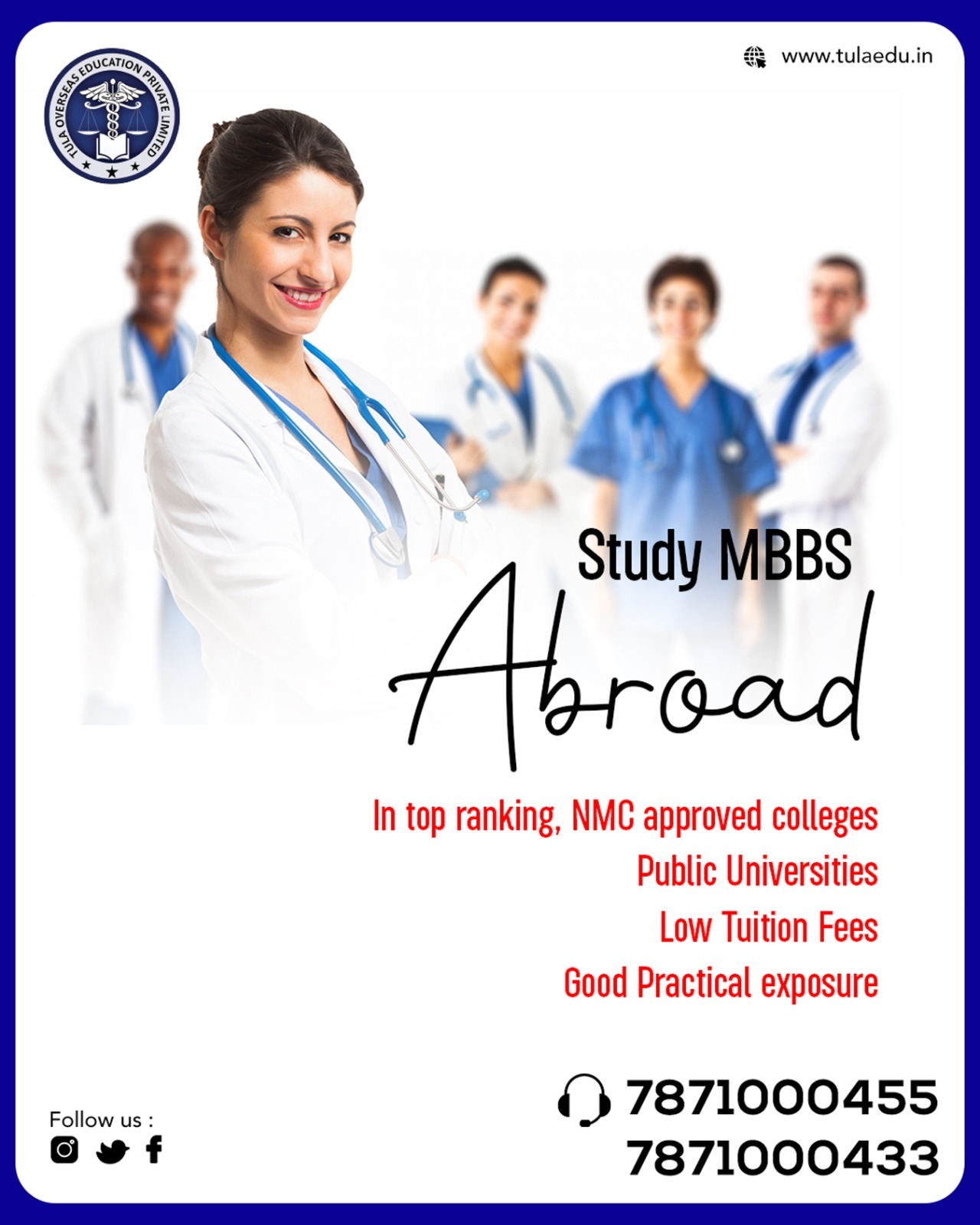 Study Abroad MBBS with Tula Overseas Education Dreaming of becoming a doctor by studying MBBS abroad? Tula Overseas Education is your trusted partner to turn that dream into reality. We specialize in providing end-to-end guidance for students who want to pursue MBBS abroad in top medical universities across countries like Russia, Uzbekistan, Bangladesh, Kyrgyzstan, Kazakhstan, and more. With globally recognized universities, affordable fee structures, and English-medium programs, studying MBBS abroad has never been easier.
