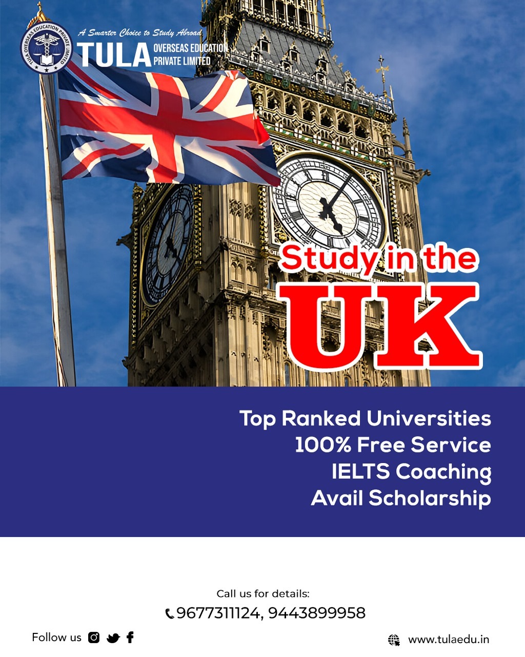 Study in UK with Tula Overseas Education Dreaming of studying in the United Kingdom? Tula Overseas Education helps you turn that dream into reality with expert guidance and end-to-end support. The UK is one of the most preferred study destinations for international students, offering world-class universities, globally recognized degrees, advanced teaching methods, and excellent career opportunities.